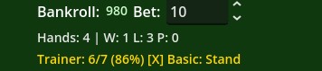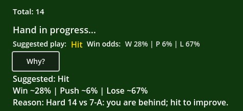 A fast, no-frills trainer to practice optimal blackjack decisions. See outcomes, track your bankroll, and tune rules to match the tables you play.