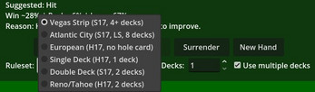 Configurable rules (rulesets, deck count, multi-deck toggle).